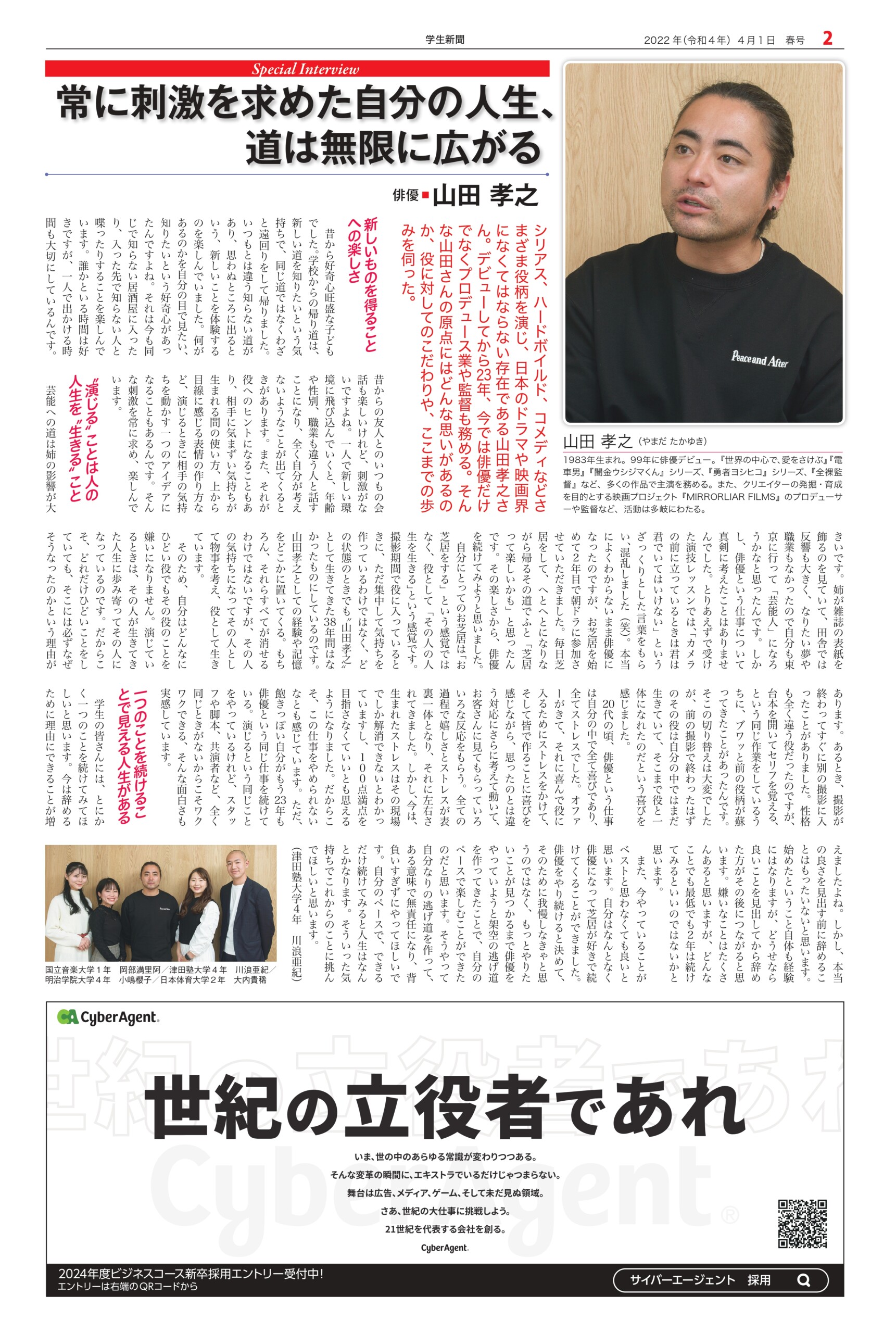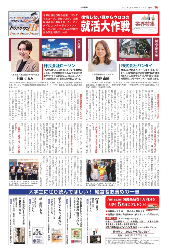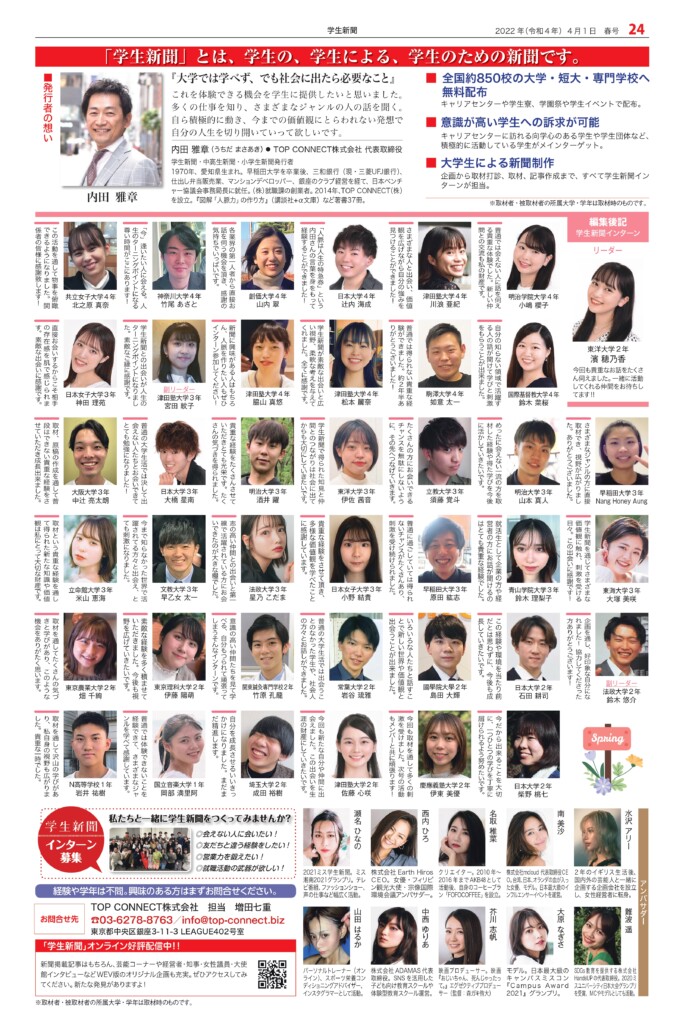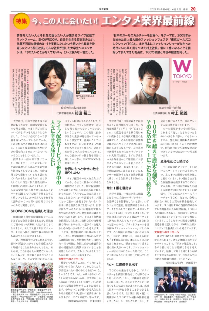 Student newspaper October 2022 issue 2022.04.01 +1 Hatena Pocket RSS Feedly Pin it +1 Hatena Pocket RSS Feedly Pin it Student newspaper intern, Management, entertainer comment: 0 W TOKYO Co., Ltd. President and CEO Noriyoshi Murakami Tokyu Agency Co., Ltd. List of related articles Yasushi Funakoshi, CEO of HIKKY Inc. / CVO (Chief... 2025.02.14 Michinori Mizuno, Chairman of the Board, Sony Music Foundation 2023.04.13 Kasumi Yamaya I'm looking forward to the scenery that awaits me at the end of my journey, so I'll do my best now 2021.10.07 Actor Kentaro Ito 2024.10.01 Fashion show "Gap, Hint" Waseda University Textile... 2024.12.29 "Multi-Unit Apartment" Dress Rehearsal Report ~ "Myself..." 2025.08.05 Special Talk "Let's Learn About Uzbekistan" 2023.01.30 Stage play "FINAL FANTASY BRAVE EXVIUS Phantom War THE STAGE..." 2026.02.05 Comment (0) Trackback (0) There are no comments on this article. There is no trackback to this article. Trackback URL To cancel reply. Name (required) E-MAIL (required) *will not be published URL