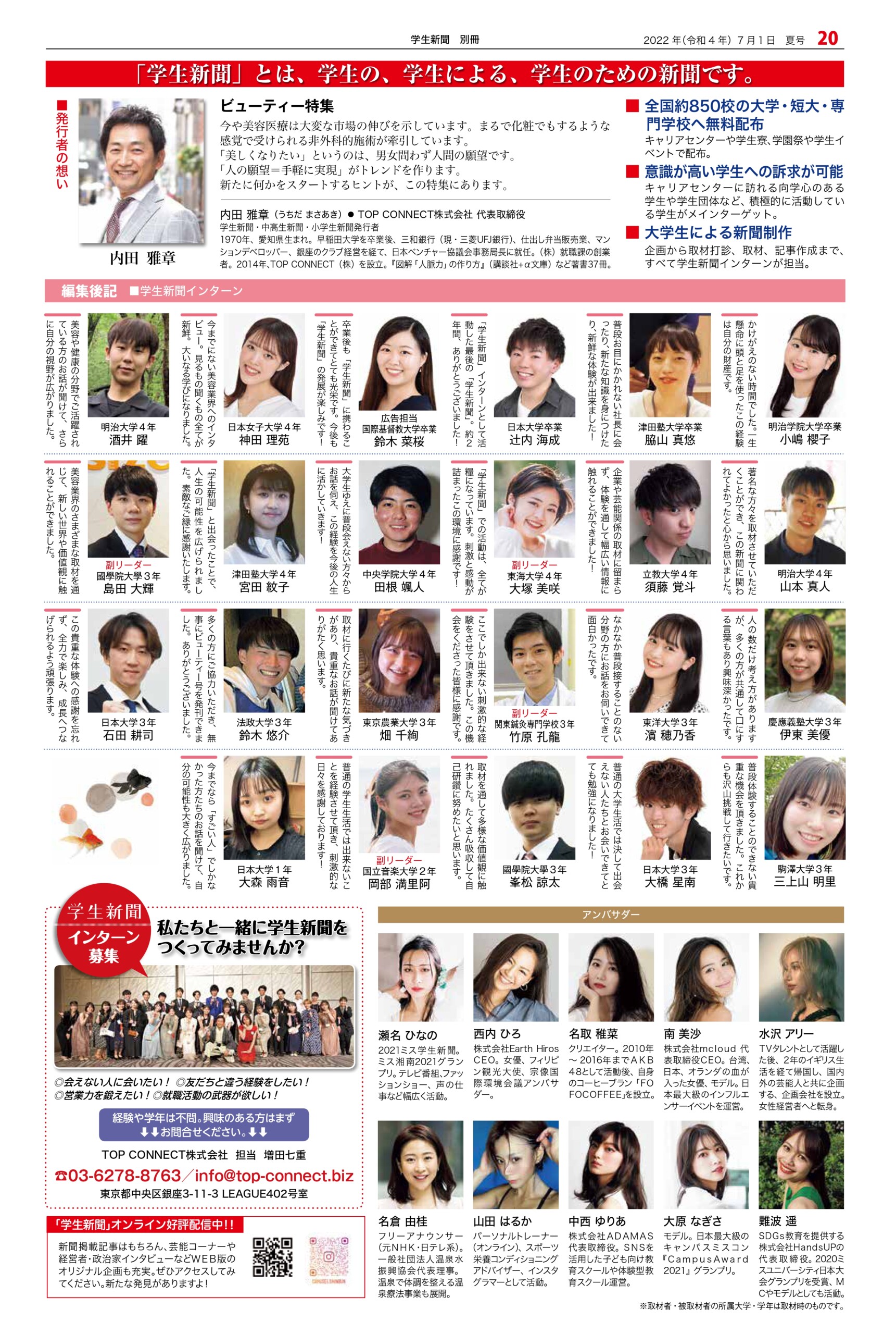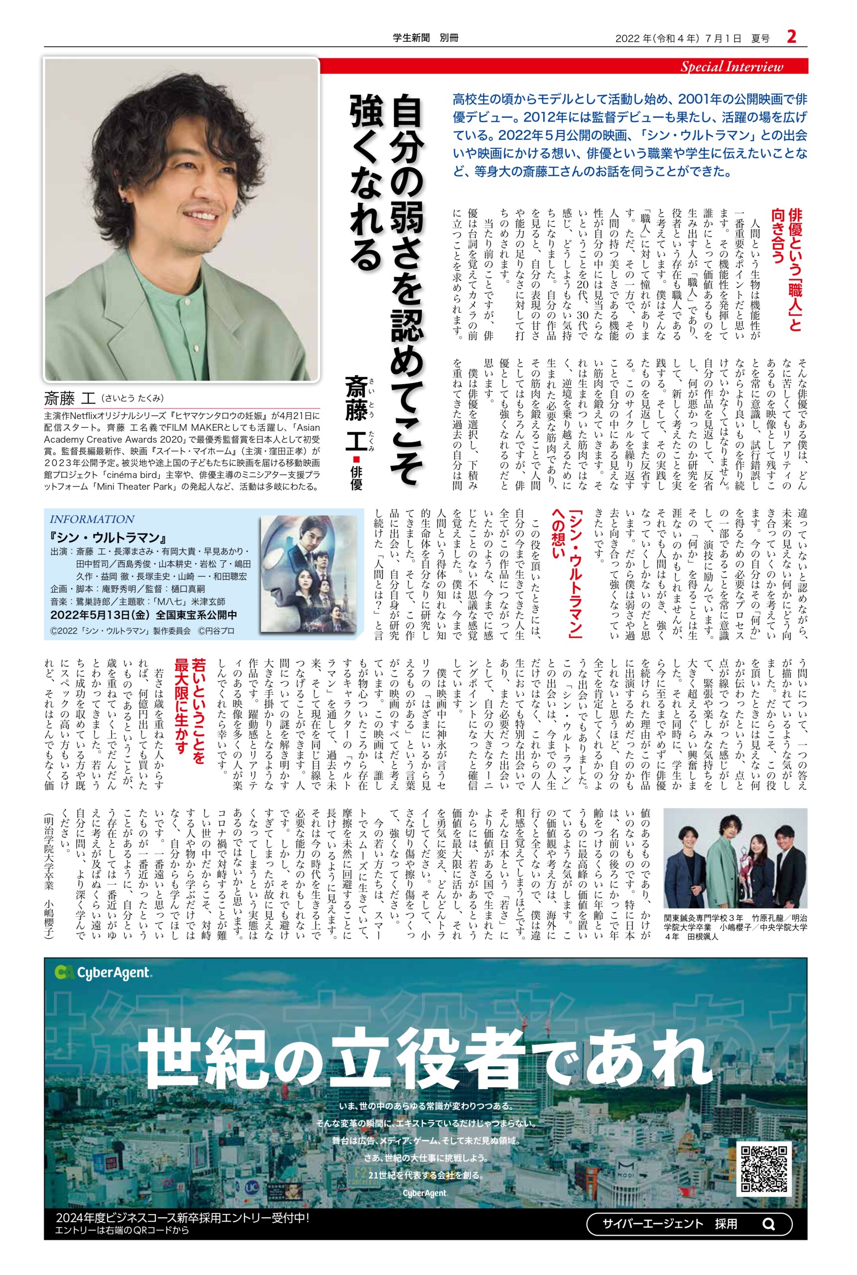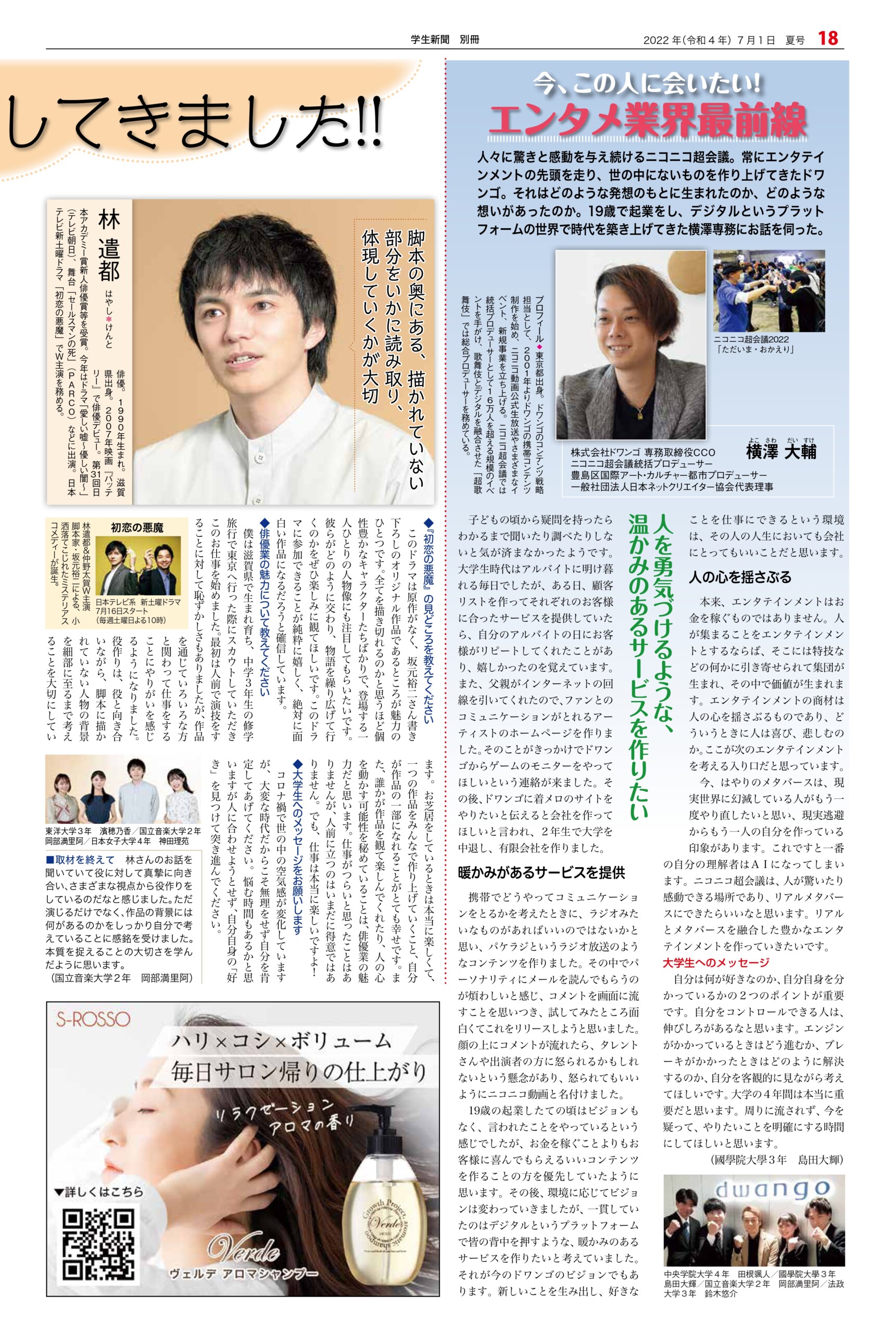 Student Newspaper April 2022 Special Edition 2022.07.01 +1 Hatena Pocket RSS Feedly Pin it +1 Hatena Pocket RSS Feedly Pin it Student newspaper intern, Management, entertainer comment: 0 Kento Hayashi: How to read the hidden parts deep within the script... Regina Clinic Group Director Masaaki Kimura List of related articles Actor, screenwriter, and producer Akiko Iwase 2023.08.02 The 39th Mynavi Tokyo Girls Collection 2024 AUTUMN... 2024.11.16 Magokoro Group Co., Ltd. Representative Director Naka... 2022.07.01 Hiroyuki Tsuneishi, President and CEO of Sprix Co., Ltd. 2019.10.31 "Multi-Unit Apartment" Dress Rehearsal Report ~ "Myself..." 2025.08.05 EM Net Japan Co., Ltd./Benefit Co., Ltd. 2022.04.01 Yuichiro Ichitani, Member of the House of Representatives of the Japan Restoration Party 2023.09.19 Stage play "FINAL FANTASY BRAVE EXVIUS Phantom War THE STAGE..." 2026.02.05 Comment (0) Trackback (0) There are no comments on this article. There is no trackback to this article. Trackback URL To cancel reply. Name (required) E-MAIL (required) *will not be published URL