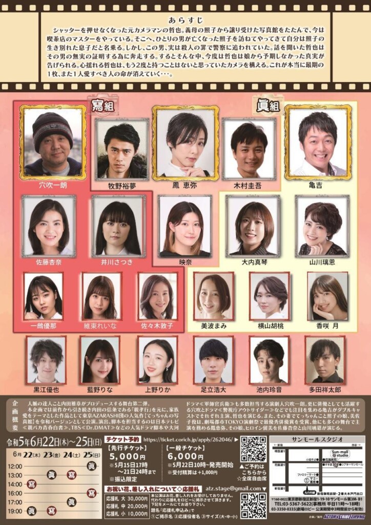 The second stage production by Masaaki Uchida, the master of connections. Continuing on from his previous work, this project is a Reiwa-era version of the Tokyo AZARASHI troupe's popular play "Tecchan's Photo Studio," based on Uchida's belief in "filial piety." The production is directed and written by Ichiro Anabuki, a theater scientist known for his work on popular dramas such as Nippon Television's "Oyakodaka Seishun Hakusho" and TBS's "Dr. DMAT," as well as the historical drama "Gunshi Kanbei." Anabuki, who is also active as an actor, and Kamekichi, who has attracted attention for his work in the drama "Metropolitan Police Department Outsider," will each play the lead role of Tetsuya. His wife and daughter, Teruko's "Tecchan," Misako, will be played by Megumi Otori, who won the Best Actor Award at the Tokyo Theater City Theater Festival and has starred in numerous stage productions. Sato Anna and Yamakawa Rio will play the heroine's daughter, Rumi.